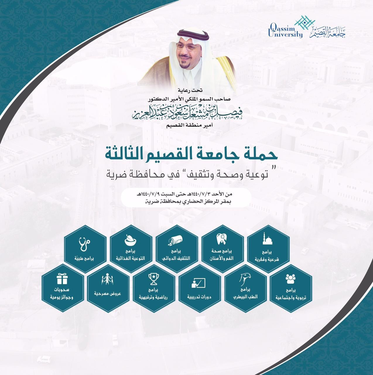 وتقيم الجامعة هذه الحملة بصورة سنوية في أحد المناطق النائية في منطقة القصيم، حيث يتم تقديم العديد من الخدمات والبرامج التوعوية والصحية والتثقيفية لأهالي تلك المحافظة في أماكن تواجدهم، وقد حرص سعادته على أن تحظى تلك المبادرة على سمو أمير المنطقة، الذي تكرم بتكليفه بتنفيذ حملة هذا العام في محافظة ضريه وذلك بعد نجاح حملتي الجامعة الأولى والثانية في ضليع رشيد وعقلة الصقور على التوالي.