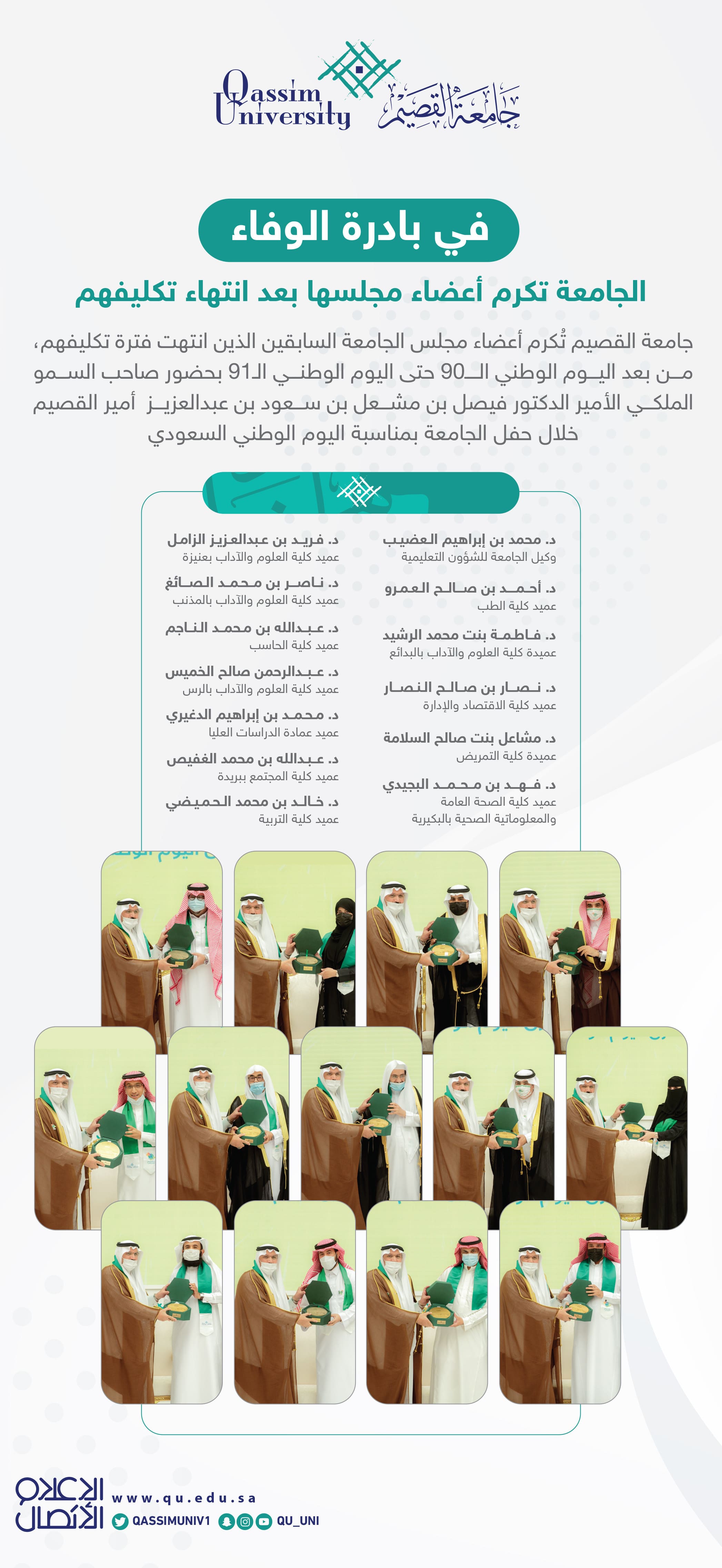 وجاء التكريم للأعضاء الذين انتهت فترة تكليفهم بعد اليوم الوطني الـ90 وحتى اليوم الوطني الـ 91، في بادرة وفاء وثناء لهم، حيث تم تكريم سعادة وكيل الجامعة للشؤون التعليمية الدكتور محمد بن إبراهيم العضيب، وعميد كلية الطب الدكتور أحمد بن صالح العمرو، وعميدة كلية العلوم والآداب بالبدائع الدكتورة فاطمة بنت محمد الرشيد، وعميد كلية الاقتصاد والإدارة الدكتور نصار بن صالح النصار، وعميدة كلية التمريض الدكتورة مشاعل بنت صالح السلامة، وعميد كلية الصحة العامة والمعلوماتية الصحية بالبكيرية الدكتور فهد بن محمد البجيدي، وعميد كلية العلوم والآداب بعنيزة الدكتور فريد بن عبدالعزيز الزامل، وعميد كلية العلوم والآداب بالمذنب الدكتور ناصر بن محمد الصائغ، وعميد كلية الحاسب الدكتور عبدالله بن محمد الناجم، وعميد كلية العلوم والآداب بالرس الدكتور عبدالرحمن صالح الخميس، وعميد عمادة الدراسات العليا الدكتور محمد بن إبراهيم الدغيري، وعميد كلية المجتمع ببريدة الدكتور عبدالله بن محمد الغفيص، وعميد كلية التربية الدكتور خالد بن محمد الحميضي.
