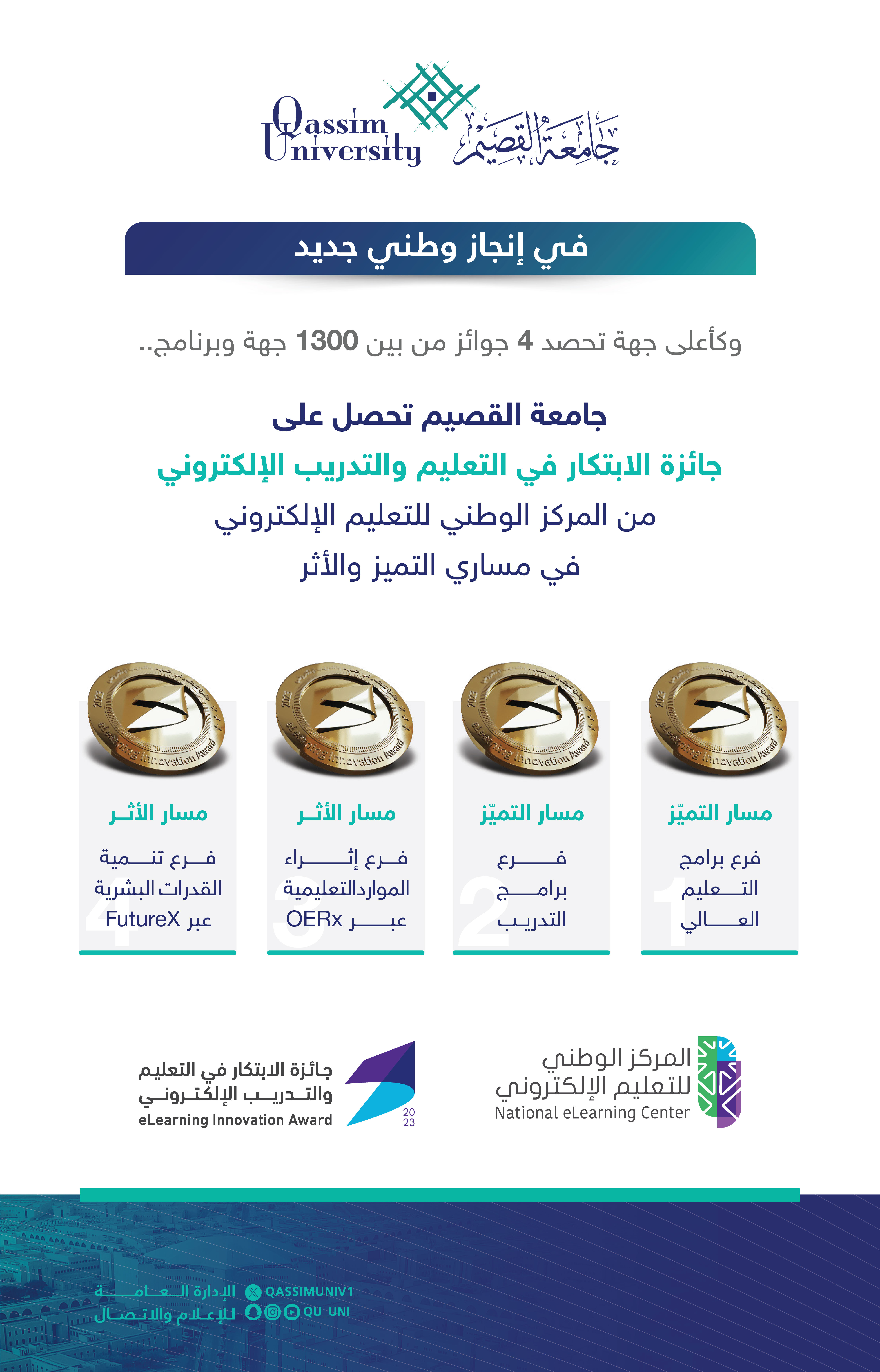 حيث حققت الجامعة جائزتين في مسار التميّز "فرع برامج التعليم العالي، وفرع برامج التدريب"، كما حققت جائزتين في مسار الأثر "فرع إثراء الموارد التعليمية عبر OERx" وفرع تنمية القدرات البشرية عبر FutureX".